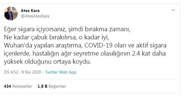 Koronavirüs Bilim Kurulu üyesi, Hacettepe Üniversitesi Tıp Fakültesi Çocuk Enfeksiyon Hastalıkları Çocuk Enfeksiyon Hastalıkları ve Bağışıklama Derneği Başkanı Prof. Dr. Ateş Kara, Twitter hesabından yaptığı açıklamada, koronavirüsün ortaya çıktığı Çin'in Vuhan kentinde yapılan araştırmanın sonucunu paylaşarak, sigaranın etkisine dikkat çekti
