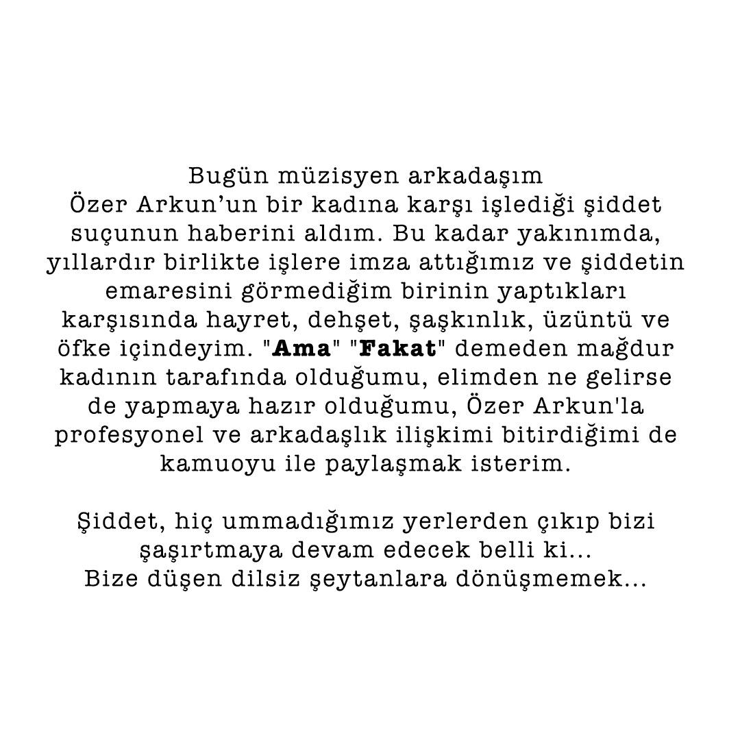 "Bugün müzisyen arkadaşım Özer Arkun’un bir kadına karşı işlediği şiddet suçunun haberini aldım. Bu kadar yakınımda, yıllardır birlikte işlere imza attığımız ve şiddetin emaresini görmediğim birinin yaptıkları karşısında hayret, dehşet, şaşkınlık, üzüntü ve öfke içindeyim. “Ama" “Fakat" demeden mağdur kadının tarafında olduğumu, elimden ne gelirse de yapmaya hazır olduğumu, Özer Arkun'la profesyonel ve arkadaşlık ilişkimi bitirdiğimi de kamuoyu ile paylaşmak isterim. Şiddet, hiç ummadığımız yerlerden çıkıp bizi şaşırtmaya devam edecek belli ki... Bize düşen dilsiz şeytanlara dönüşmemek."