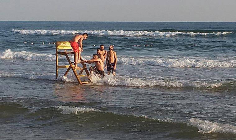 Şile, Ayazma Plajı'nda cankurtaran ekiplerinin gözetleme kulesini yerinden söküp denize taşıyan bir grup genç kulenin üzerinden denize atlamak için birbirleriyle yarıştı.