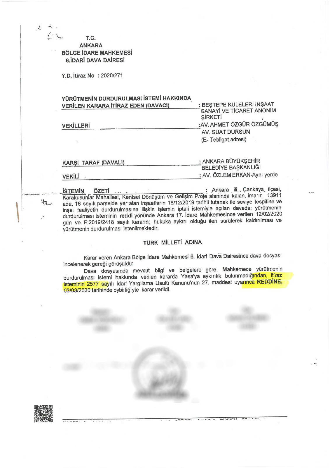Ankara Büyükşehir Belediyesi’nce mühürlenen TOGO kulelerine ilişkin Sinan Aygün tarafından işlemin iptali ve yürütmeyi durdurma başvurusu üst mahkemede reddedildi. Aygün’ün yerel mahkemenin işlemin iptali ve yürütmeyi durdurma kararına itiraz amacıyla başvurduğu Ankara Bölge İdare Mahkemesi de yerel mahkemenin red kararının yasaya uygun olduğunu belirterek itiraz istemini geri çevirdi.