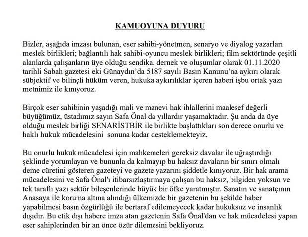 Ortak bir açıklama yayımlayan birlikler "Bu onurlu hukuk mücadelesi için mahkemeleri gereksiz davaları ile uğraştırdığı şeklinde yorumlayan ve bununla kalmayıp bu haksız davaların bir sınırı olmalı deme cüretini gösteren gazeteyi ve gazete yazarını şiddetle kınıyoruz. Bir hak arama mücadelesini ve Safa Önal'ı itibarsızlaştırmaya çalışan bu haksız, bilgiden yoksun ve tek taraflı yazı sektör bileşenlerinde büyük bir öfke yaratmıştır" ifadelerini kullandı.