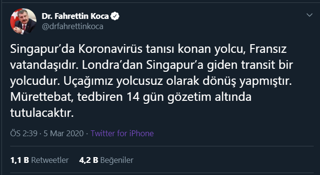 İstanbul’dan Singapur’a 3 Mart’ta uçan Türk Hava Yolları’nın TK54 numaralı uçağında bir yolcuda koronavirüsü (Covid-19) tespit edilmesiyle ilgili Sağlık Bakanı Fahrettin Koca açıklama yaptı. Koca, uçak mürettabtının 14 gün boyunda tedbiren gözetim altında tutulacağını açıkladı. Koca, Twitter adresinden yaptığı açıklamada, virüs tanısı konulan kişinin Fransız vatandaşı olduğunu söyledi. Koca yaptığı açıklamada, “Singapur’da Koronavirüs tanısı konan yolcu, Fransız vatandaşıdır. Londra’dan Singapur’a giden transit bir yolcudur. Uçağımız yolcusuz olarak dönüş yapmıştır. Mürettebat, tedbiren 14 gün gözetim altında tutulacaktır” dedi.