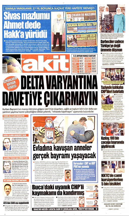 AKP'ye yakın medya organları arasında gerici ve kışkırtıcı yayıncılığıyla öne çıkan Yeni Akit, Ahmet Turan Kılıç'ın ölümünü taşıdığı baş sayfasında Kılıç için "İdamla yargılanıp, 27 yıl boyunca suçsuz yere hapiste yatmıştı: Sivas mazlumu Ahmet dede Hakk'a yürüdü" ifadelerini kullandı.