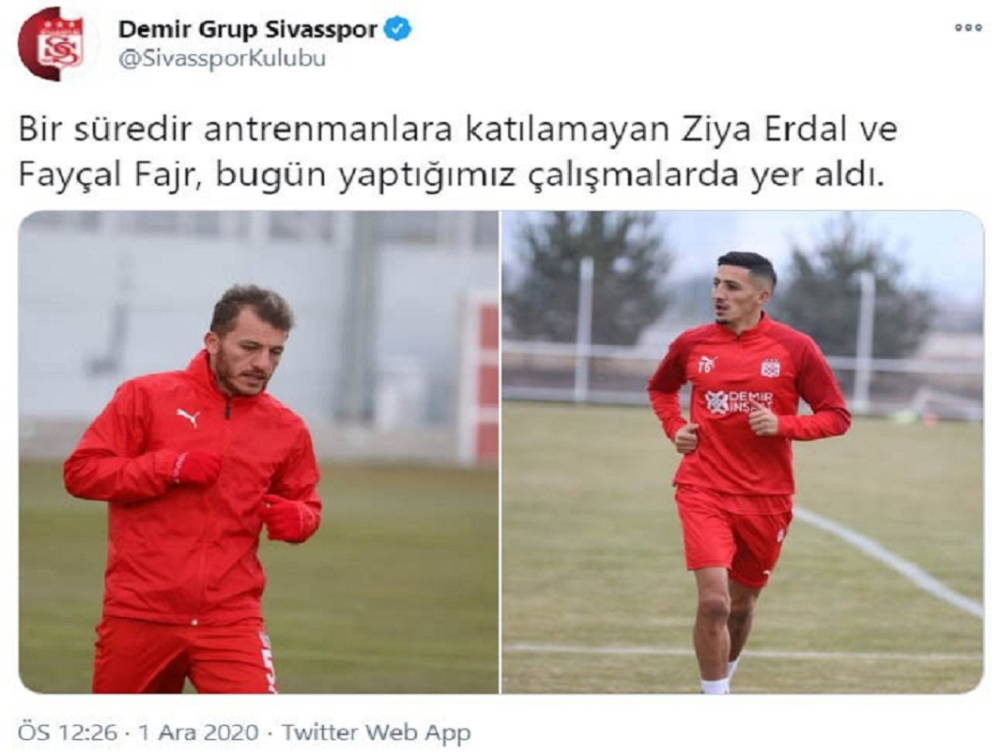 Fajr ve Erdal’ın korona virüsü atlattığını Sivasspor Kulübü sosyal medya hesaplarından duyurdu. İki futbolcunun antrenmanda fotoğrafını paylaşan kırmızı-beyazlı kulüp paylaşıma, “Bir süredir antrenmanlara katılamayan Ziya Erdal ve Fayçal Fajr, bugün yaptığımız çalışmalarda yer aldı” notunu ekledi.