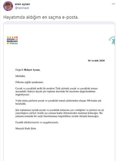Behçet Aysan'ın kızı Eren Aysan, akıl almaz davetin yazısını Twitter hesabından paylaşırken "Hayatımda aldığım en saçma e-posta." diye tepki gösterdi.