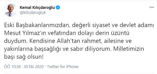 CHP Genel Başkanı Kemal Kılıçdaroğlu, Yılmaz'ın vefatından derin üzüntü duyduğunu belirterek, "Kendisine Allah’tan rahmet, ailesine ve yakınlarına başsağlığı ve sabır diliyorum. Milletimizin başı sağ olsun!" dedi.