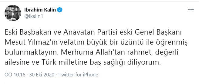 Cumhurbaşkanlığı Sözcüsü İbrahim Kalın, mesajında, "Eski Başbakan ve Anavatan Partisi eski Genel Başkanı Mesut Yılmaz'ın vefatını büyük bir üzüntü ile öğrenmiş bulunmaktayım. Merhuma Allah'tan rahmet, değerli ailesine ve Türk milletine baş sağlığı diliyorum" ifadelerini kullandı.