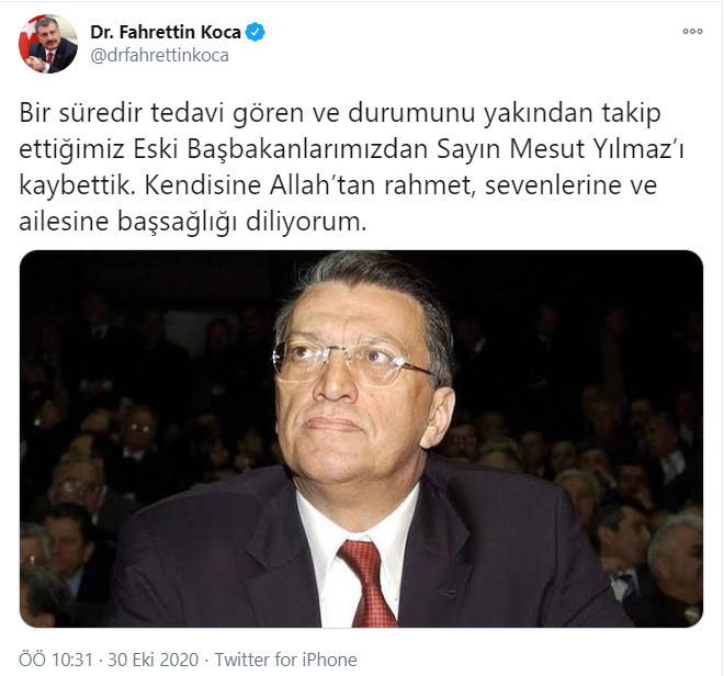 Sağlık Bakanı Fahrettin Koca, "Bir süredir tedavi gören ve durumunu yakından takip ettiğimiz Eski Başbakanlarımızdan Sayın Mesut Yılmaz’ı kaybettik. Kendisine Allah’tan rahmet, sevenlerine ve ailesine başsağlığı diliyorum" dedi.