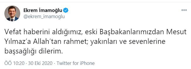 İstanbul Büyüşkşehir Belediye Başkanı Ekrem İmamoğlu, "Vefat haberini aldığımız, eski Başbakanlarımızdan Mesut Yılmaz’a Allah’tan rahmet; yakınları ve sevenlerine başsağlığı dilerim" dedi.