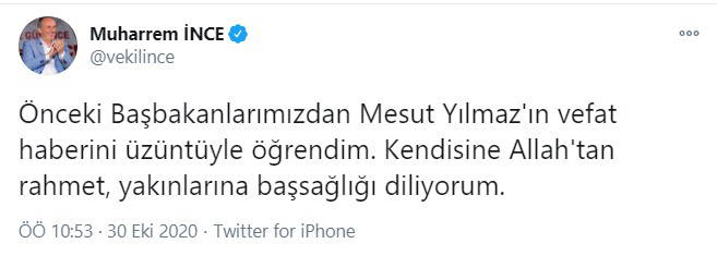 CHP'li Muharrem İnce, "Önceki Başbakanlarımızdan Mesut Yılmaz'ın vefat haberini üzüntüyle öğrendim. Kendisine Allah'tan rahmet, yakınlarına başsağlığı diliyorum" ifadelerini kullandı.