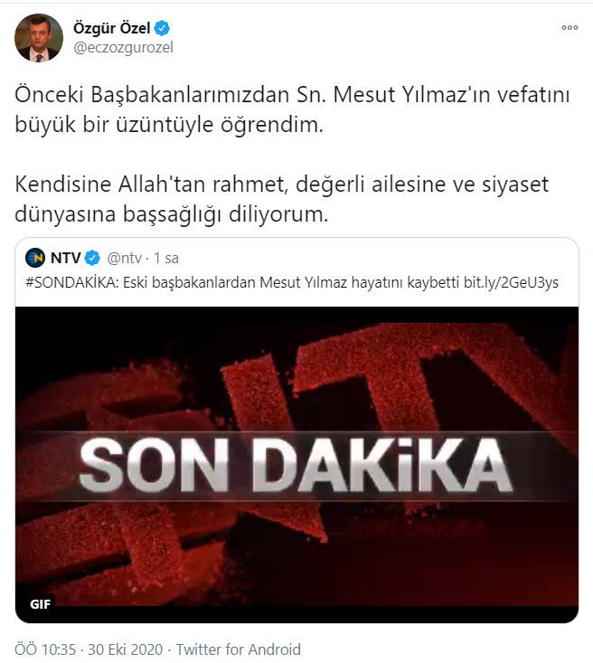 CHP'li Özgür Özel, "Önceki Başbakanlarımızdan Sn. Mesut Yılmaz'ın vefatını büyük bir üzüntüyle öğrendim. Kendisine Allah'tan rahmet, değerli ailesine ve siyaset dünyasına başsağlığı diliyorum" dedi.