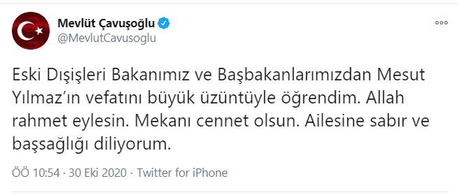Dışişleri Bakanı Mevlüt Çavuşoğlu, "Eski Dışişleri Bakanımız ve Başbakanlarımızdan Mesut Yılmaz’ın vefatını büyük üzüntüyle öğrendim. Allah rahmet eylesin. Mekanı cennet olsun. Ailesine sabır ve başsağlığı diliyorum" ifadelerini kullandı.