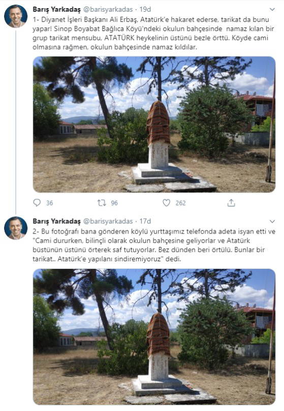 Diyanet İşleri Başkanı Ali Erbaş, Atatürk'e hakaret ederse, tarikat da bunu yapar! Sinop Boyabat Bağlıca Köyü'ndeki okulun bahçesinde namaz kılan bir grup tarikat mensubu, Atatürk heykelinin üstünü bezle örttü. Köyde cami olmasına rağmen, okulun bahçesinde namaz kıldılar.