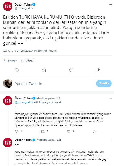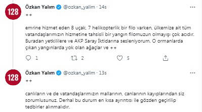 "Elin yabancısı senin yanan ormanına değil alacağı paraya bakar. Bu nedenle yerli ve milli olan THK derhal yapılandırılmalı eski işlevine kavuşturulmalıdır. Saraya tahsisli bir kişinin emrine hizmet eden 8 uçak, 7 helikopterlik bir filo varken, ülkemize ait tüm vatandaşlarımızın hizmetine tahsisli bir yangın filomuzun olmayışı çok acıdır. Buradan yetkililere ve AKP Saray İktidarına sesleniyorum. O ormanlarda çıkan yangınlarda yok olan ağaçlar ve canlıların ve de vatandaşlarımızın mallarının, canlarının kayıplarından siz sorumlusunuz. Derhal bu durum en kısa ayrıntısı ile gözden geçirilip tedbirler alınmalıdır."
