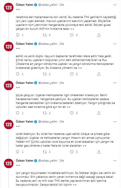 "Yangın çıktığında ise uçtukları saat sürecine göre ayrı bir ek ücret ödeniyor. Bu ücret her nedense uçak sahibi ülkeye ve şirkete göre değişiyor. Uçaklar ve helikopterler yangın ihbarını alır almaz uçmuyorlar. Neden mi? Çünkü uçtukları süre boyunca ek ücret alacakları için yangın ne kadar geç sönerse o kadar fazla ek ücret alacakları için yangın büyümeden müdahale edilmiyor. Bu İddialar doğru ise vahim bir durumdur"