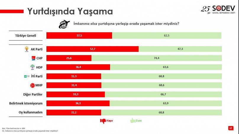 Araştırma verilerine göre, Türkiye’de gençlerin %62,5’i eğer imkan olsa yurtdışına yerleşip orada yaşamak istediğini belirtiyor. Ayrıca rapordaki bir çarpıcı veri de kendi oy verdikleri partinin yıllardır iktidarda olmasına rağmen, AKP'li gençlerin dahi neredeyse yarısının eğer imkanı olsaydı yurtdışında yaşamak istediğini ifade etmesi. Yurtdışında yaşamak isteyenlerin oranı CHP’ye oy veren gençlerde %74,4’e, İyi Parti’ye oy verenlerde %68,8, henüz oy kullanmayanlarda yine %68,8, MHP’ligençlerde %68,6’ya yükseliyor.