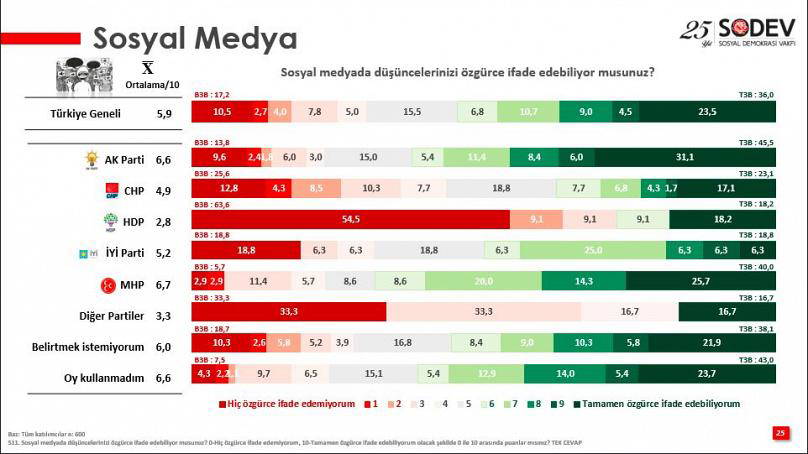 SODEV’in araştırması sosyal medyada düşüncelerini ortaya koyma özgürlükleri ile ilgili önemli bir ayrışmaya işaret ediyor. Türkiye genelinde gençlerin %25’i sosyal medyada kendilerini özgürce ifade edemediklerini düşünüyor. Bu oran özellikle HDP’li, CHP’li ve İyi Partili seçmenlerde çok daha yüksek oranlarda seyrediyor.