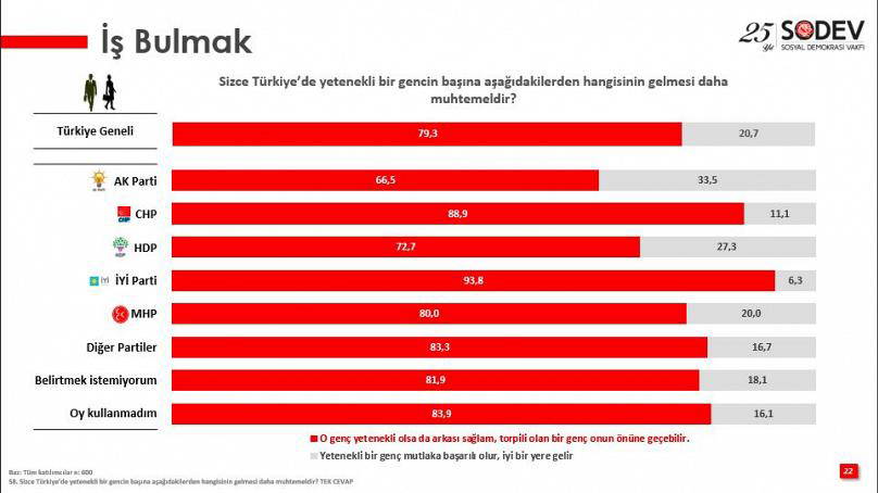 SODEV araştırmasına katılan gençlerin %40,8’i Türkiye’de üniversitelerin iş bulmak için yeterli donanım sağladığını düşünmüyor. Bu oran HDP seçmeni gençlerde %72,8’e, İyi Parti’li seçmende %56,4’e, CHP’li seçmen gençlerde %49,5’e, MHP’li seçmende %48,5’e yükseliyor.