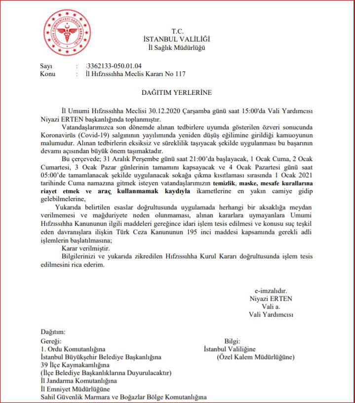 “Alınan tedbirlerin eksiksiz ve süreklilik taşıyacak şekilde uygulanması bu başarının devamı açısından büyük önem taşımaktadır. Bu çerçevede; 31 Aralık Perşembe günü saat 21.00'da başlayacak, 1 Ocak Cuma, 2 Ocak Cumartesi, 3 Ocak Pazar günlerinin tamamını kapsayacak ve 4 Ocak Pazartesi günü saat 05.00'de tamamlanacak şekilde uygulanacak sokağa çıkma kısıtlaması sırasında 1 Ocak 2021 tarihinde Cuma namazına gitmek isteyen vatandaşlarımızın temizlik, maske, mesafe kurallarına riayet etmek ve araç kullanmamak kaydıyla ikametlerine en yakın camiye gidip gelebilmelerine karar verilmiştir.”
