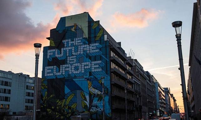Brüksel’de AB kurumlarının bulunduğu Schuman Meydanı’ndan La Loi Caddesi’ne doğru inerken karşınıza çıkan binanın duvarına Belçikalı sanatçı NovaDead tarafından yapılmış 30 metrelik grafitide, “The future is Europe” (Gelecek Avrupa’dır) yazısı dikkatinizi çekiyor. Çirkin kentleşme örneği olarak mimari literatürüne “Brükselleşme” sözcüğünü armağan eden semte, farklı bir renk katıyor bu yapıt.