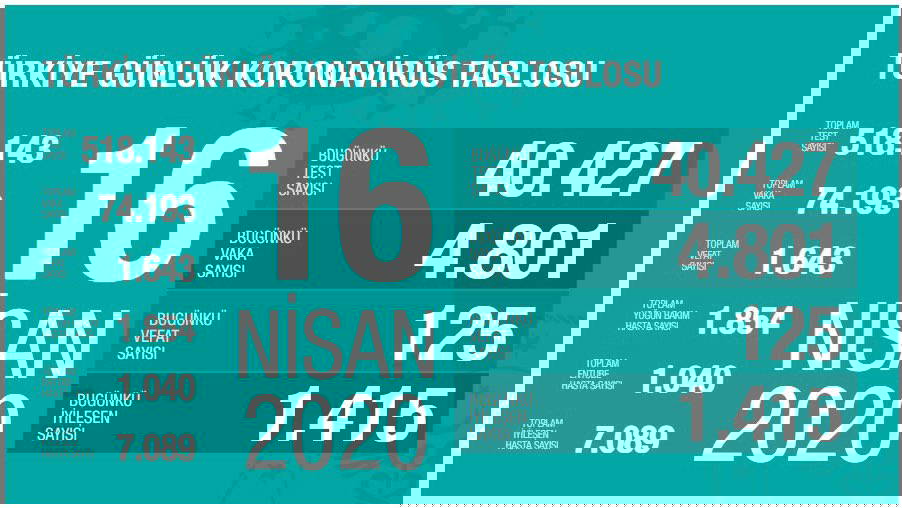 Sağlık Bakanı Fahrettin Koca'nın açıkladığı yeni verilere göre son 24 saatte 125 yurttaş yaşamını yitirirken, ülkedeki vaka sayısı da 74 bin 193'e yükseldi. Koca'nın Twitter adresinde paylaştığı tabloda 4 bin 801 yeni vaka kaydedildi.