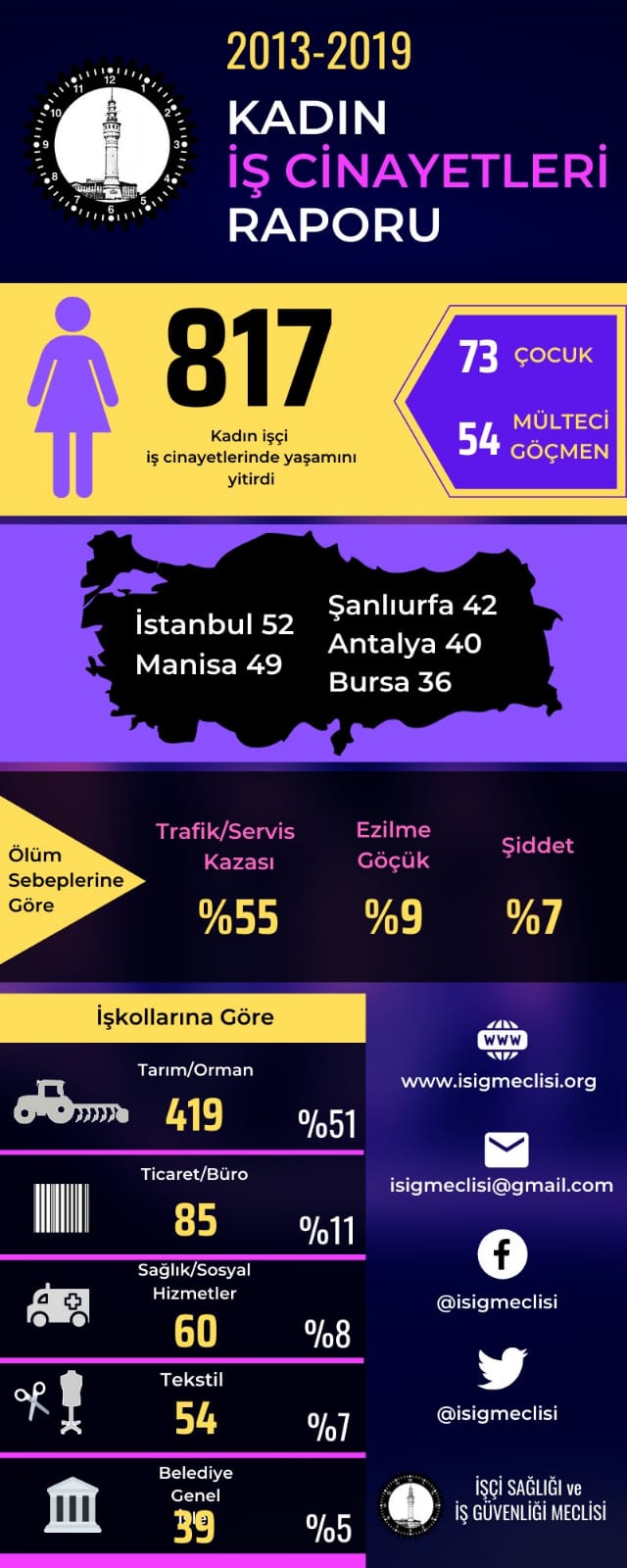 İşçi Sağlığı ve İş Güvenliği Meclisi’nin (İSİG) Kadın İş Cinayetleri Raporu'na göre, 2013 - 2019 yılları arasında en az 817 kadın işçi, iş cinayetlerinde yaşamını yitirdi. 817 kadın işçinin 148’ini çifti, 48'ini esnaf, 621’ini ücretli çalışan (işçi ve memur) kadınlar oluşturdu. Yaşamını yitiren kadınların 54’ü mülteci/göçmen olarak kayda geçerken, kadınların yüzde 98’inin ise sendikasız olduğu belirtildi.