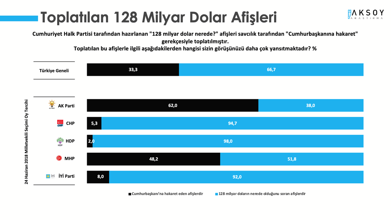 Araştırmada en çok dikkat çeken detay ise, Cumhur İttifakı'nın bir bileşeni olan MHP seçmeninin %51,8’inin “128 Milyar dolar nerede?” afişlerinin Cumhurbaşkanı’na karşı hakaret içermediğini söylemesi oldu. Aynı soruya AKP seçmeninin %62’si “hakaret içermektedir” %38’i ise hakaret içermemektedir yanıtını verdi.