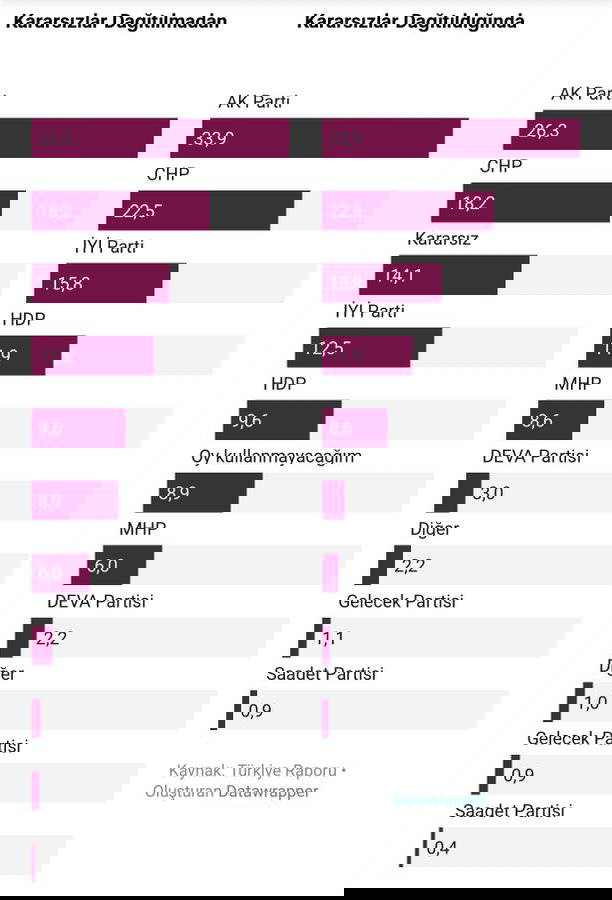 Kararsızlar dağıtıldığında ise AKP'nin oyu yüzde 33.9'da, MHP'nin oyu ise yüzde 8.6'da kaldı.