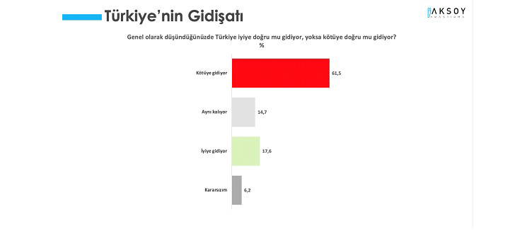 Aksoy Araştırma tarafından her ay düzenli olarak açıklanan ‘Türkiye Monitörü’ araştırmasının Şubat 2021 sonuçları açıklandı. Araştırmaya katılanların yüzde 61,5’i Türkiye’nin kötüye gittiğini düşünürken, “İyiye gidiyor” diyenlerin oranı yüzde 17,6 seviyesinde kaldı. Seçmenin en öncelikli gündemi ise yüzde 77,9 ile “ekonomi” oldu. Pandemi döneminde “AKP mitinglerinin sonlandırılması gerekmektedir” diyenlerin oranı yüzde 86 olarak açıklandı.