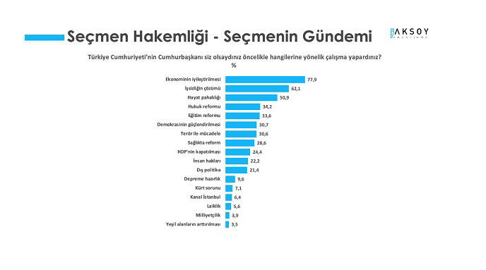 Araştırmada kamuoyunun gündemini belirlemek için Türkiye’nin Cumhurbaşkanı olmaları durumunda hangi alanları daha çok gündeme getirecekleri sorusu sorulduğunda ise, araştırmaya katılanların gündeminin ilk sırasında %77,9 ile ekonominin iyileştirilmesi yer aldı. İkinci sırada %62,1 ile işsizliğin çözümü ve üçüncü sırada %50,9 ile hayat pahalılığı başlıkları yer aldı. Laiklik %5,6, milliyetçilik %3,9 ve yeşil alanların artırılması %3,5 ile seçmenin gündeminde görece daha az yer bulan konu başlıkları oldular.