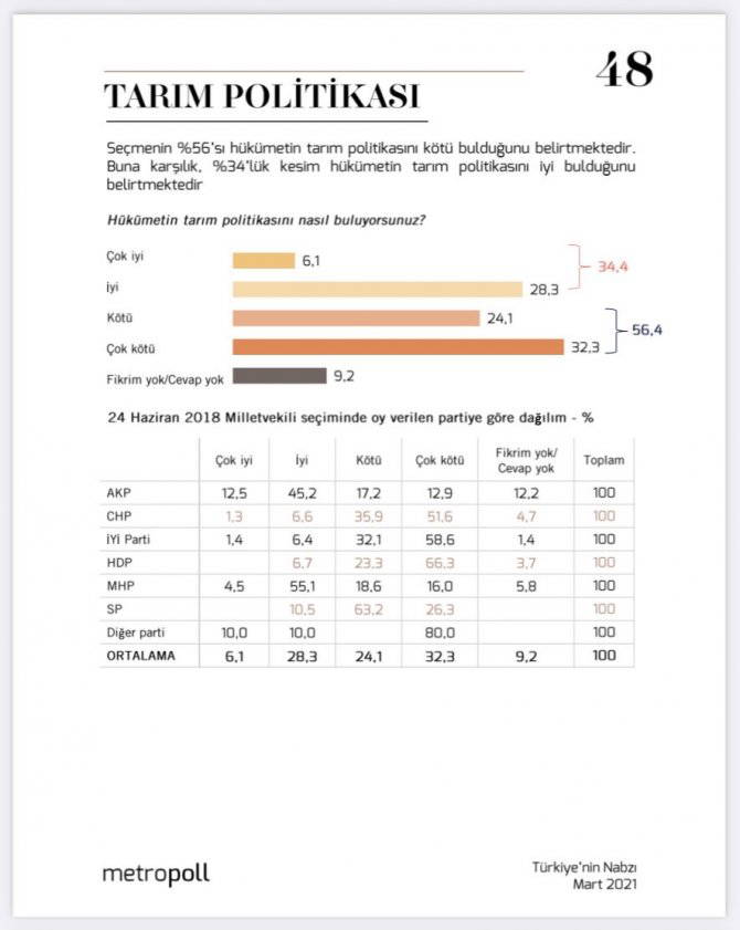 Metropoll Araştırma Şirketinin yaptığı anketten, uygulanan tarım politikalarına karşı seçmenin memnuniyetsiz olduğu ortaya çıktı.