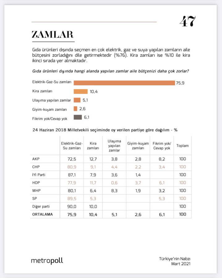 Metropoll'ün yapılan zamlara ilişkin bir diğer araştırmasında ise halka "Gıda ürünleri dışında hangi alanda yapılan zamlar aile bütçenizi daha çok zorlar?" diye soruldu. Gıda ürünleri dışında seçmenin yüzde 76'sı en çok elektirik, gaz ve suya yapılan zamların aile bütçesini zorladığını diletirdi. Kira zamları ise yüzde 10 ile ikinci sırada yer aldı.