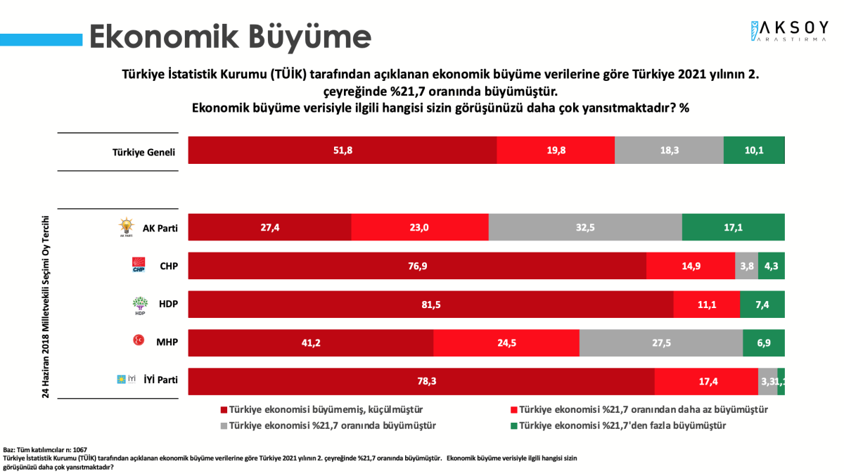 Aksoy Araştırma tarafından yürütülen Türkiye Monitörü araştırmasında, TÜİK tarafından açıklanan ekonomik büyüme verilerine göre Türkiye 2021 yılının 2. çeyreğinde %21,7 oranında büyüdüğü açıklandı. Ekonomik büyüme verisiyle ilgili 'hangisi sizin görüşünüzü daha çok yansıtmaktadır?' sorusu soruldu. Araştırma sonuçlarına göre, katılımcıların yüzde 51,8’i “Türkiye ekonomisi büyümemiş, küçülmüştür” yanıtını verirken; yüzde 19,8 “Türkiye ekonomisi %21,7 oranından daha az büyümüştür” yanıtını verdi.