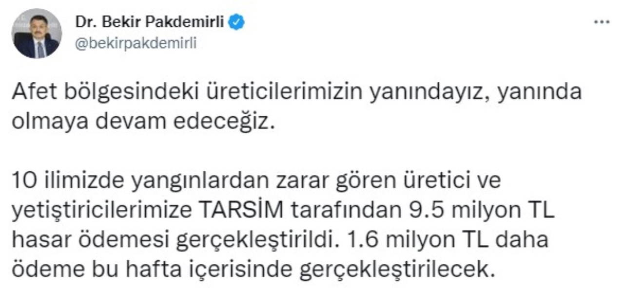 Bakan Pakdemirli, Twitter hesabından yaptığı açıklamada, "Afet bölgesindeki üreticilerimizin yanındayız, yanında olmaya devam edeceğiz. 10 ilimizde yangınlardan zarar gören üretici ve yetiştiricilerimize Tarım Sigortaları Havuzu tarafından 9,5 milyon TL hasar ödemesi gerçekleştirildi. 1,6 milyon TL daha ödeme bu hafta içerisinde gerçekleştirilecek" dedi.