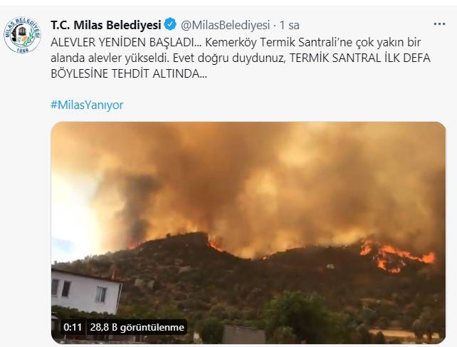 Milas Belediyesi tarafından yapılan açıklamada, “Alevler yeniden başladı. Kemerköy Termik Santrali’ne çok yakın bir alanda alevler yükseldi. Evet doğru duydunuz, termik santral ilk defa böylesine tehdit altında” ifadelerl kullanıldı.