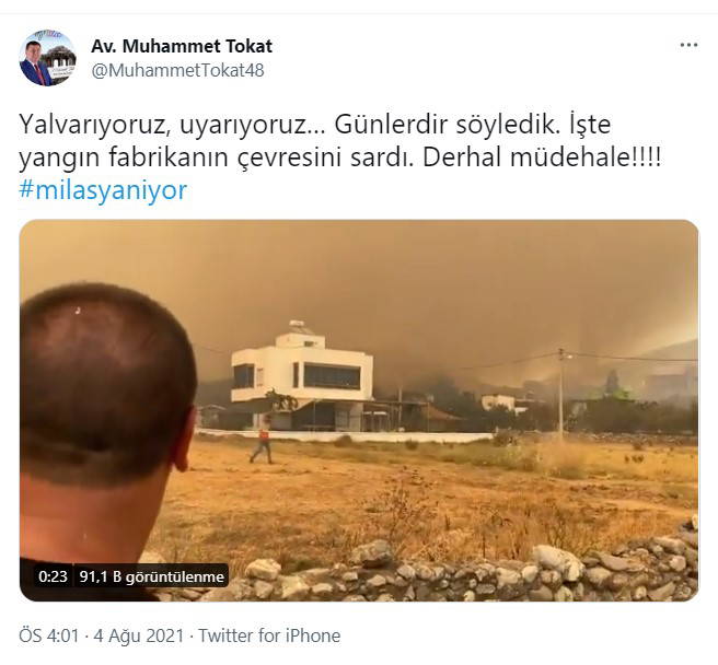 Milas Belediye Başkanı Muhammet Tokat da Twitter hesabından bir paylaşım yaptı ve havadan müdahale yapılmasını istedi. Tokat, “Acil uçak istiyoruz. Yalvarıyoruz, uyarıyoruz… Günlerdir söyledik. İşte yangın fabrikanın çevresini sardı. Derhal müdahale” diyerek çağrıda bulundu.
