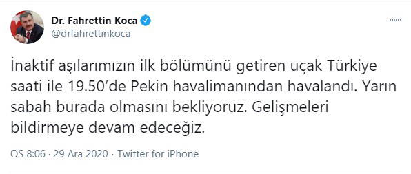Twitter üzerinden yeni paylaşım yapan Koca, ''İnaktif aşılarımızın ilk bölümünü getiren uçak Türkiye saati ile 19.50’de Pekin havalimanından havalandı. Yarın sabah burada olmasını bekliyoruz. Gelişmeleri bildirmeye devam edeceğiz'' dedi.