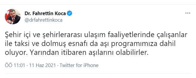 Aşı çalışmalarına ilişkin sosyal medya hesabından yeni açıklama yapan Sağlık Bakanı Fahrettin Koca, ''Şehir içi ve şehirlerarası ulaşım faaliyetlerinde çalışanlar ile taksi ve dolmuş esnafı da aşı programımıza dahil oluyor. Yarından itibaren aşılarını olabilirler'' dedi.