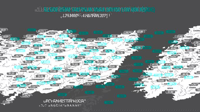 1 Haziran itibariyle 'kademeli normalleşme' takviminin ikinci etabının başlamasının ardından Sağlık Bakanı Fahrettin Koca, 29 Mayıs-4 Haziran arasında illere göre her 100 bin kişide görülen Covid-19 vaka sayılarını açıkladı.