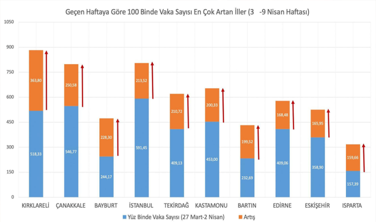 100.000 nüfusa karşılık gelen haftalık vaka sayısında en çok artış Kırklareli, Çanakkale, Bayburt, İstanbul ve Tekirdağ'da oldu. Samsun ve Ardahan'da ise azalış gerçekleşti. Yeni kararlara tam uyumla vaka sayılarını azaltmak elimizde. pic.twitter.com/7e5hwYpiov