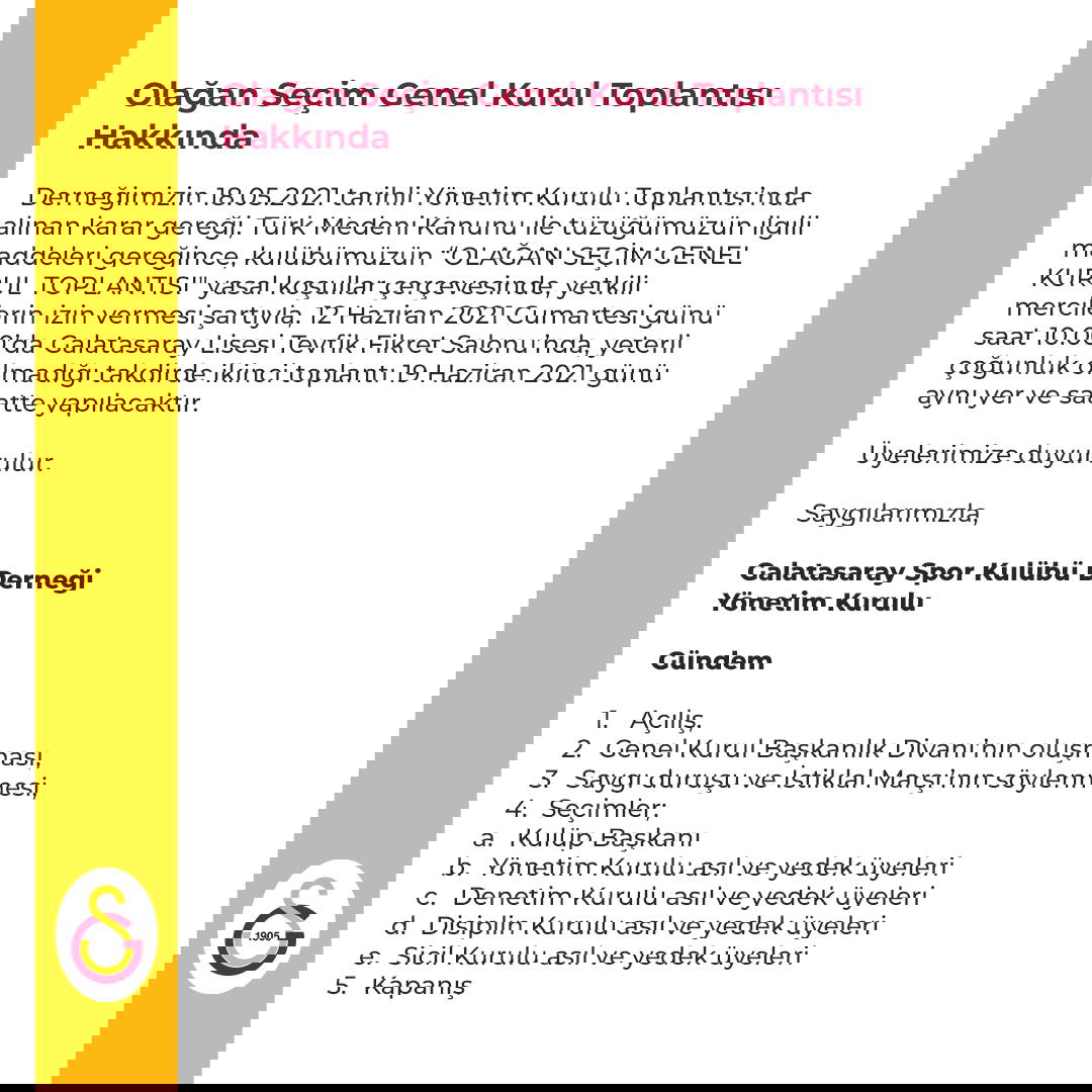 Galatasaray: "Kulübümüzün olağan seçim genel kurul toplantısı yasal koşullar çerçevesinde, yetkili mercilerin izin vermesi şartıyla, 12 Haziran 2021 Cumartesi günü saat 10.00’da Galatasaray Lisesi Tevfik Fikret Salonu’nda, yeterli çoğunluk olmadığı takdirde ikinci toplantı 19 Haziran 2021 günü aynı yer ve saatte yapılacaktır."