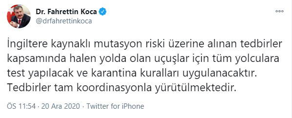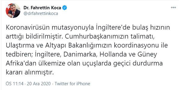 Koca, ''Koronavirüsün mutasyonuyla İngiltere'de bulaş hızının arttığı bildirilmiştir. Cumhurbaşkanımızın talimatı, Ulaştırma ve Altyapı Bakanlığımızın koordinasyonu ile tedbiren; İngiltere, Danimarka, Hollanda ve Güney Afrika'dan ülkemize olan uçuşlarda geçici durdurma kararı alınmıştır.