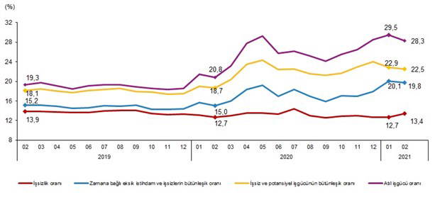 Zamana bağlı eksik istihdam, potansiyel işgücü ve işsizlerden oluşan atıl işgücü oranı 2021 yılı Şubat ayında bir önceki aya göre 1,2 puan azalarak %28,3 oldu. Zamana bağlı eksik istihdam ve işsizlerin bütünleşik oranı %19,8 iken, potansiyel işgücü ve işsizlerin bütünleşik oranı %22,5 olarak gerçekleşti.