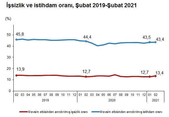 TÜİK’in açıkladığı Şubat 2021 İşgücü İstatistikleri’ne göre Türkiye genelinde 15 ve daha yukarı yaştaki kişilerde işsizlik Şubat'ta aylık bazda 0.7 puanlık artış ile yüzde 13.4'e yükselirken, aynı dönemde istihdam oranı 0.1 puanlık azalış ile yüzde 43.4 düzeyine geriledi.