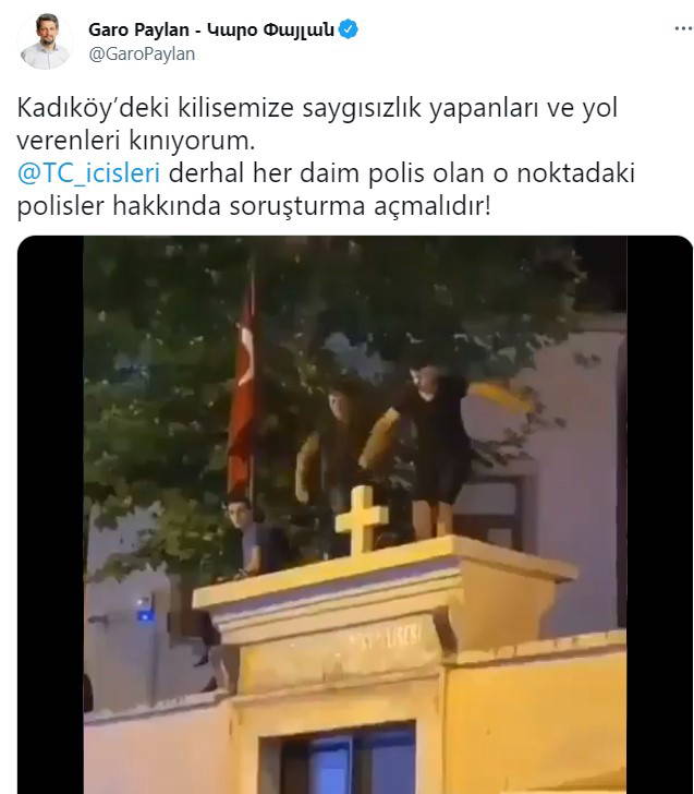 Görüntüler üzerine İçişleri Bakanlığı'na seslenen HDP Diyarbakır Milletvekili Garo Paylan, ''Kadıköy’deki kilisemize saygısızlık yapanları ve yol verenleri kınıyorum. Derhal her daim polis olan o noktadaki polisler hakkında soruşturma açmalıdır'' ifadelerini kullandı.