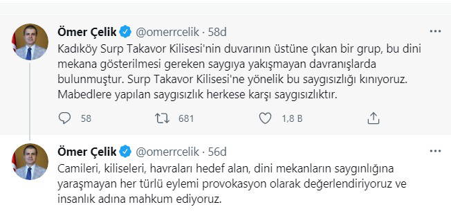 AKP Genel Başkan Yardımcısı Ömer Çelik, ''Kadıköy Surp Takavor Kilisesi'nin duvarının üstüne çıkan bir grup, bu dini mekana gösterilmesi gereken saygıya yakışmayan davranışlarda bulunmuştur. Surp Takavor Kilisesi'ne yönelik bu saygısızlığı kınıyoruz. Mabedlere yapılan saygısızlık herkese karşı saygısızlıktır. Camileri, kiliseleri, havraları hedef alan, dini mekanların saygınlığına yaraşmayan her türlü eylemi provokasyon olarak değerlendiriyoruz ve insanlık adına mahkum ediyoruz'' dedi.