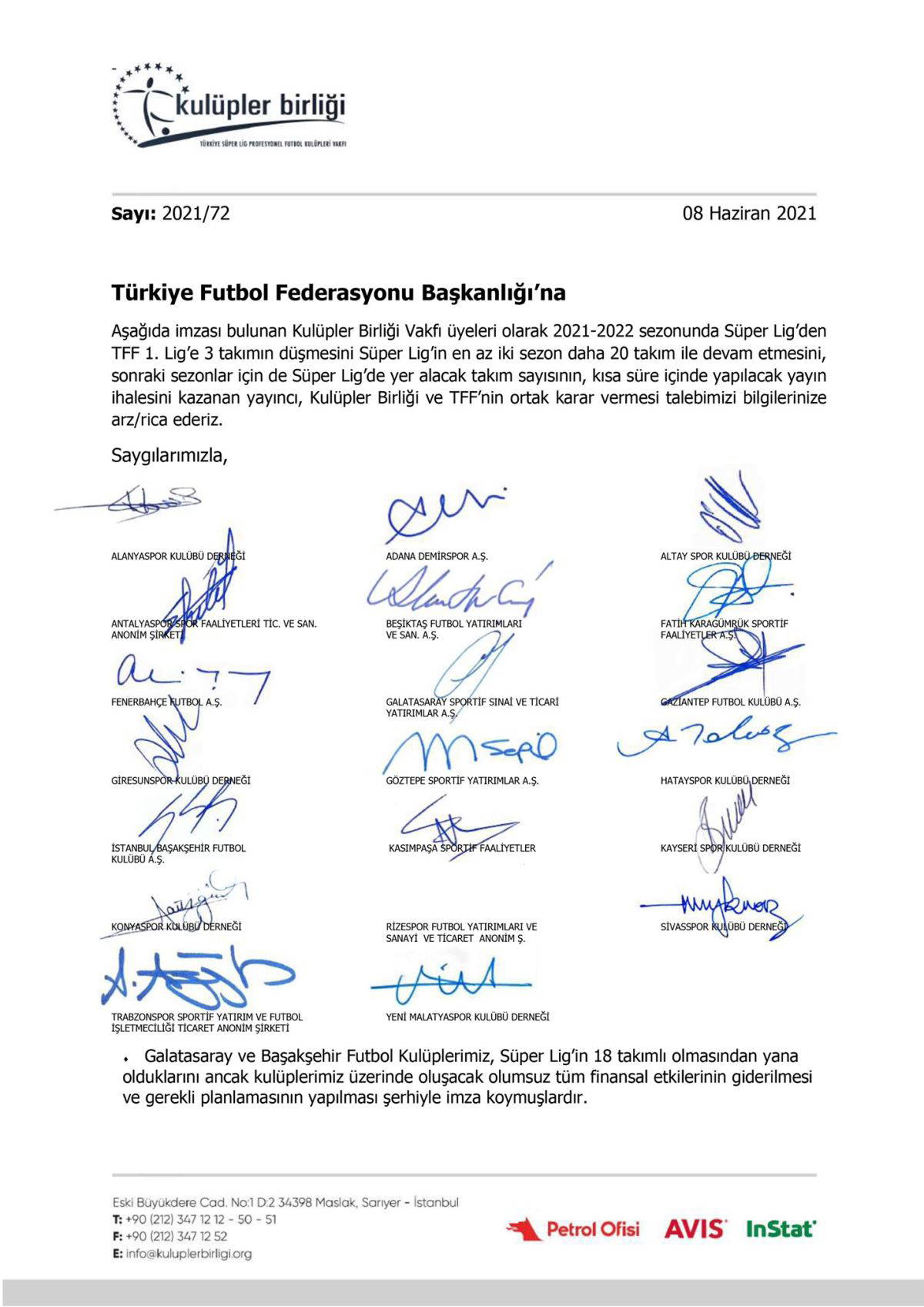Kulüpler Birliği, en az 2 sezon daha Süper Lig’in 20 takımla devam etmesi yönündeki talebini TFF’ye iletti.