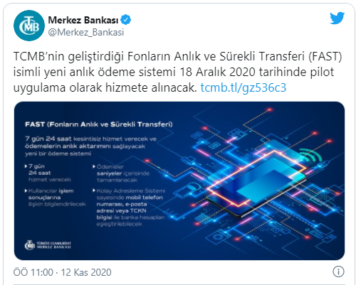 FAST Sisteminin, 18 Aralık'tan itibaren pilot uygulama olarak hizmete alınmasının ve kademeli bir şekilde vatandaşların kullanımına açılmasının planlandığı aktarılan açıklamada, "Sistemin kısa bir zaman içerisinde tüm finansal kuruluşları kapsayacak şekilde yaygınlaşması hedeflenmektedir." denildi.