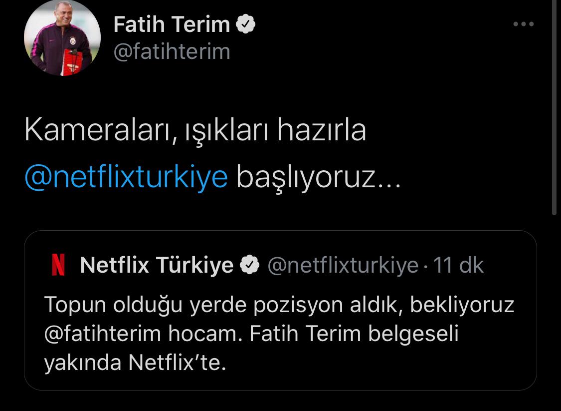 Netflix yaptığı paylaşımda: "Topun olduğu yerde pozisyonu aldık, bekliyoruz Fatih Terim hocam. Fatih Terim'in belgeseli yakında Netflix'te." ifadelerini kullandı.