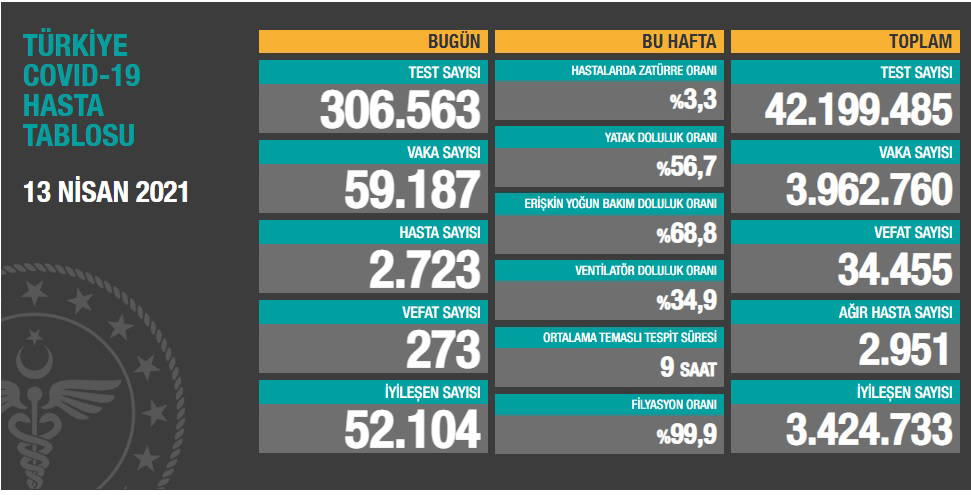 Türkiye'nin 13 Nisan 2021 güncel koronavirüs tablosu şöyle: